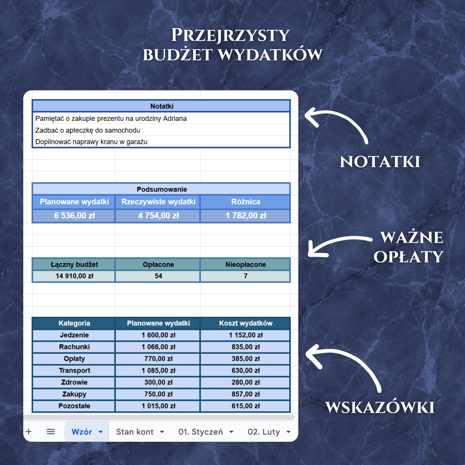 Po zakupie otrzymasz dostęp do przejrzystego wzoru, pokazującego, jak korzystać z arkusza.