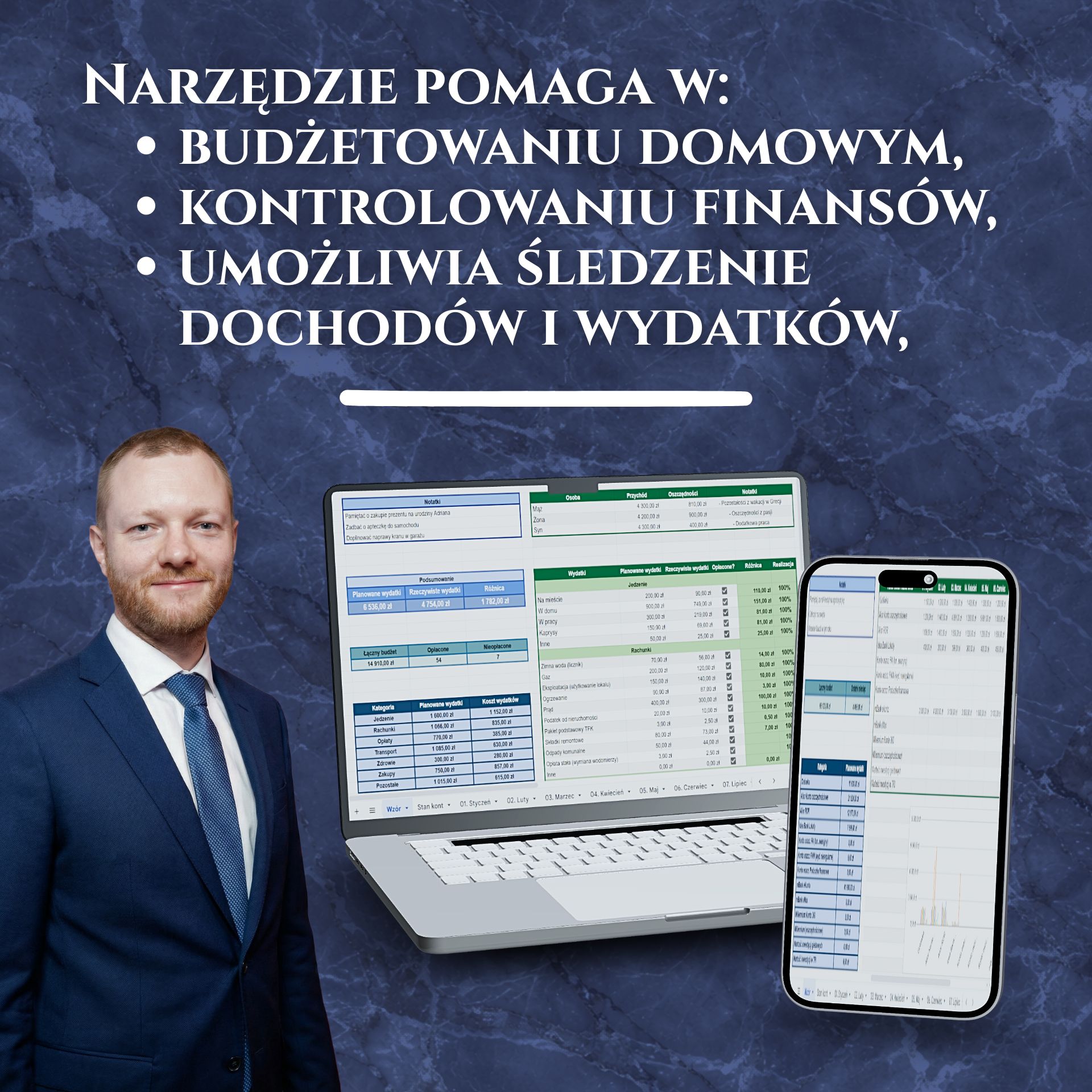 Narzędzie pomaga w budżetowaniu domowym i kontrolowaniu finansów, umożliwiając śledzenie dochodów i wydatków. Arkusz składa się z następujących elementów: